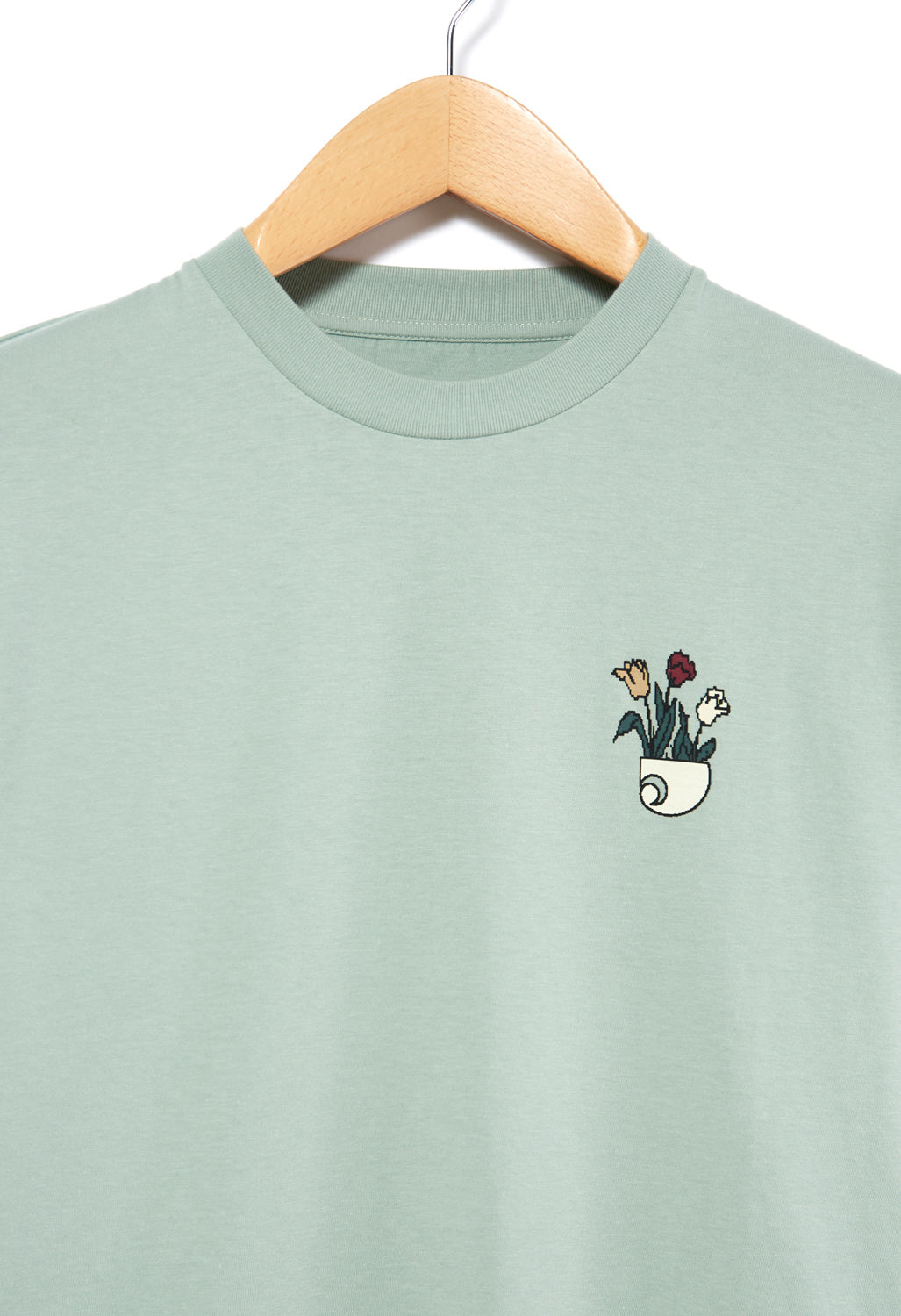 A simple, clean style produced in a soft organic cotton, it has an inverted Carhartt logo; the planter, with flowers sprouting from it as a small chest print. Feminine, neat fit.